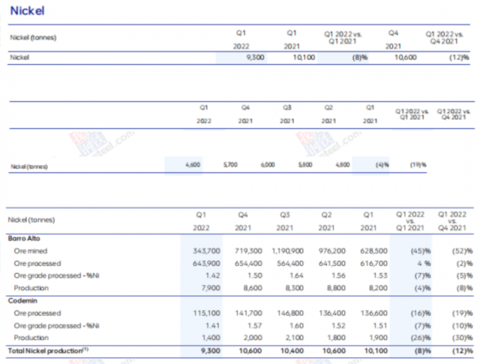 في 21 أبريل ، أصدرت أنجلو أمريكان تقريرًا عن إنتاج النيكل في الربع الأول.في الربع الأول ، أنتجت منطقتا التعدين للشركة في جنوب إفريقيا والبرازيل ما مجموعه 13900 طن.من بينها ، بلغ إنتاج منطقة التعدين البرازيلية 9300 طن ، بانخفاض 8 ٪ على أساس سنوي و 12 ٪ على أساس شهري ؛بلغ إنتاج منطقة التعدين في جنوب إفريقيا 4600 طن ، بانخفاض 4 ٪ على أساس سنوي و 19 ٪ على أساس شهري.يظل هدف إنتاج النيكل للعام بأكمله لعام 2022 دون تغيير عند 40.000-42.000 طن.