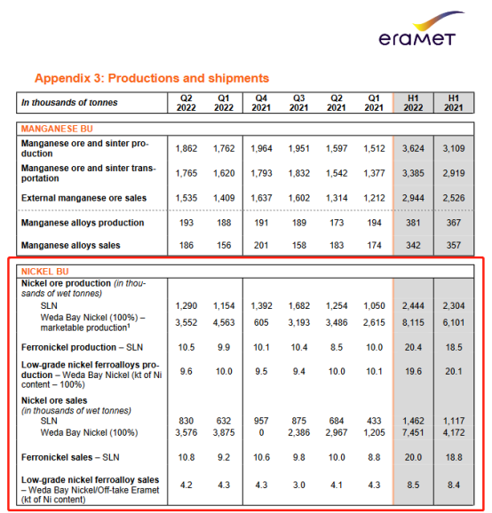 في إندونيسيا ، أنتجت المناجم ما يقرب من 8.1 مليون طن رطب من خام النيكل القابل للتسويق في النصف الأول من عام 2022 ، بزيادة 33٪ على أساس سنوي.تجاوزت مبيعات الخامات الخارجية في الربع 7.5 مليون طن رطب ، بزيادة 79٪ على أساس سنوي.أنتج مصنع سبائك النيكل والحديد ، الذي قدمه المنجم أيضًا ، 19600 طن في النصف الأول.باعت إيراميت 8.500 طن كجزء من عقد الشراء.خلال هذه الفترة ، بلغ إجمالي مساهمات Weda Bay لمجموعة FCF 121 مليون يورو ، منها 107 مليون يورو تتعلق بدفع توزيعات الأرباح وسداد قروض المساهمين.